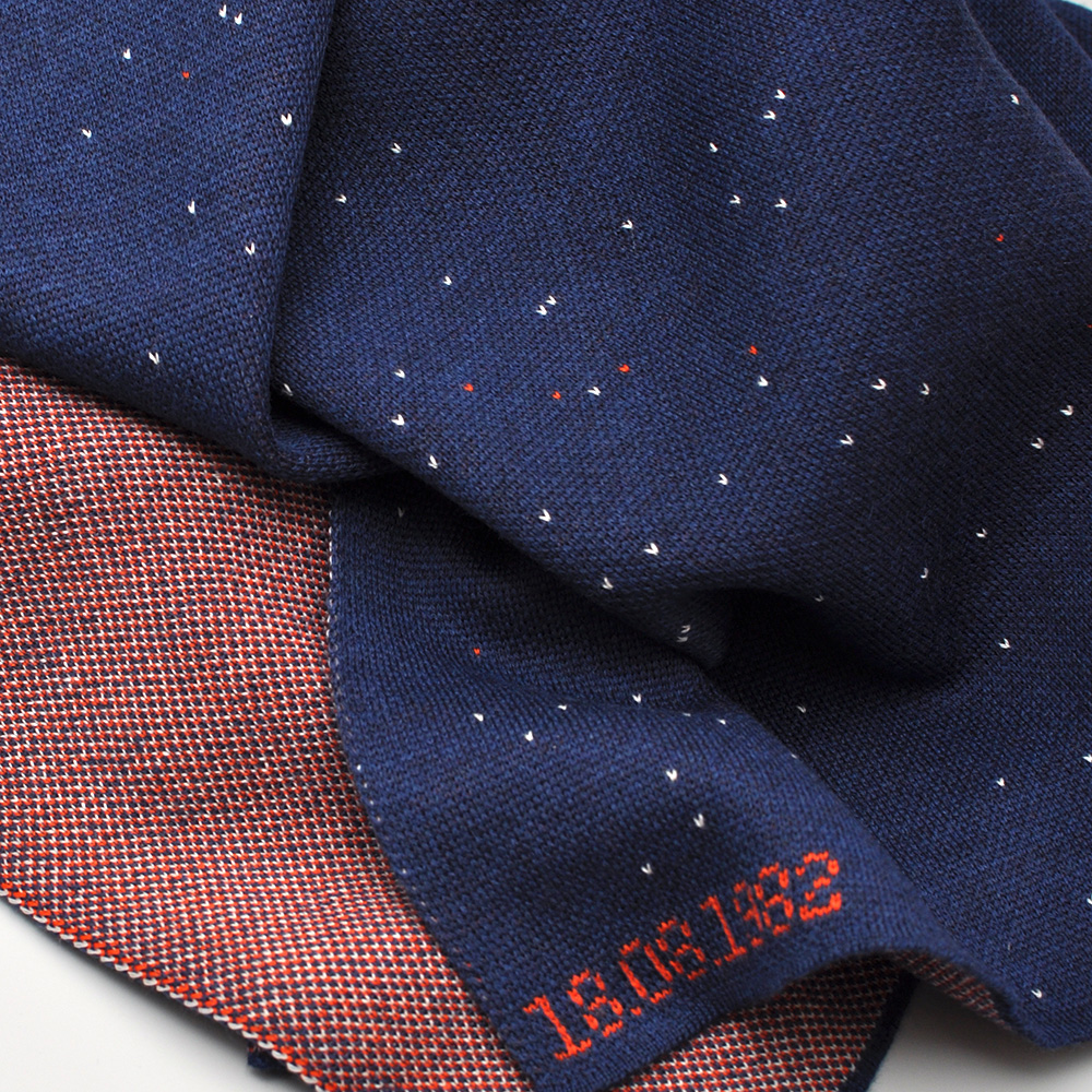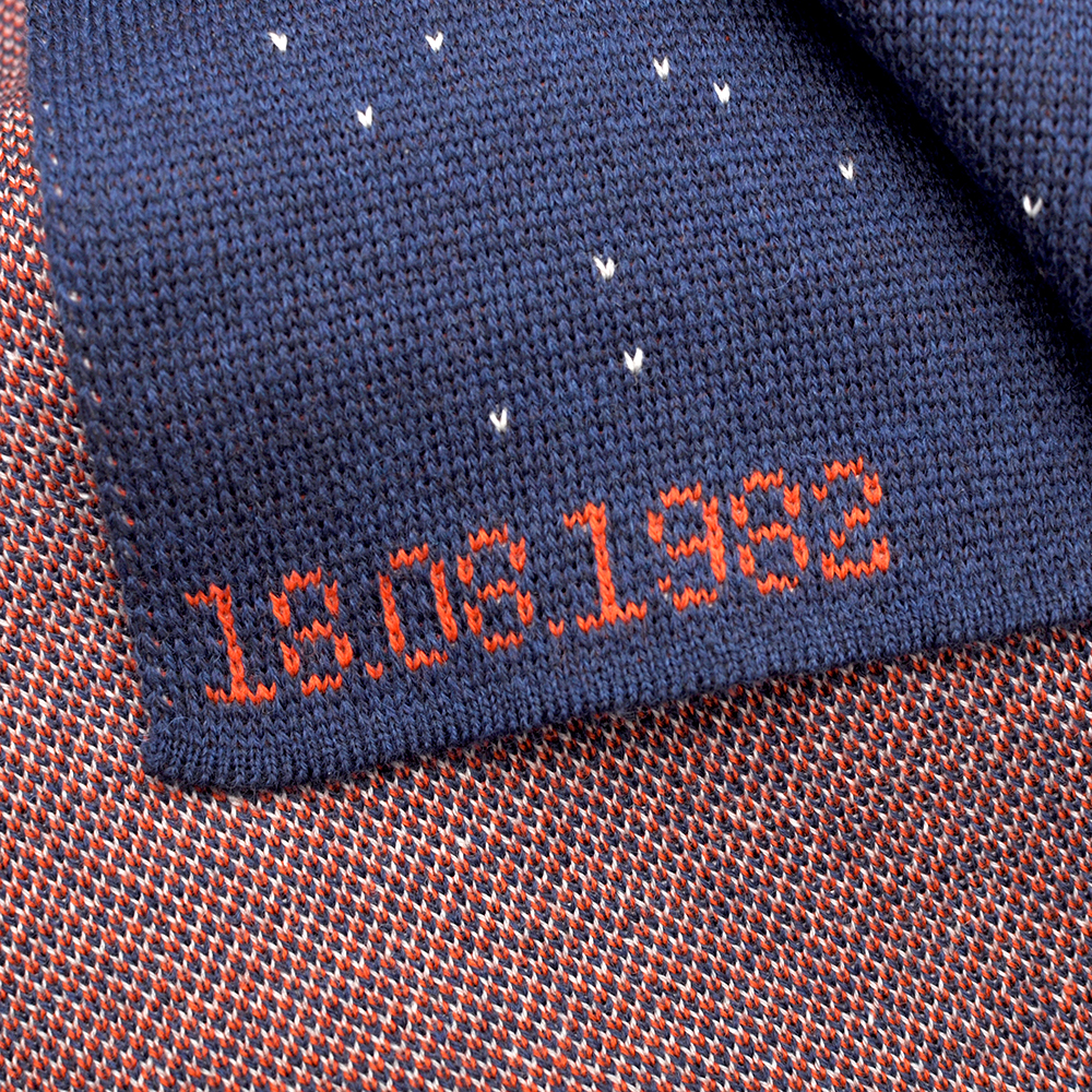 Das Muster entsteht aus dem Datum. Das individuelle Geschenk für einen Moment, den man feiern oder festhalten möchte. Hochzeitstag, Geburtstag, Jahrestag. Ein farbiger Punkt für jedes Jahr und noch ein farbiger Punkt für jeden Tag in diesem Jahr. Gestrickt als Einzelanfertigung aus hochwertigster Merinowolle.